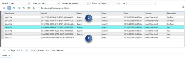 The locks table can be used to view locks or release existing route and event locks with the buttons at the top of the toolbar. A lock or group of locks can be highlighted by selecting the lock records in the table.