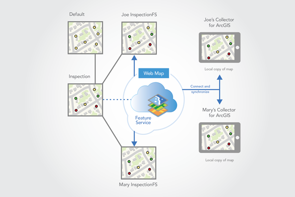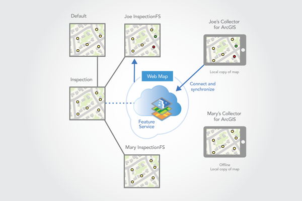 Hierfür steht den Mitgliedern der Büromitarbeitergruppe im Organisationskonto der Firma eine Webkarte zur Verfügung. Mitarbeiter, die dieser Gruppe angehören, können auf die Webkarte mithilfe von ArcGIS Collector zugreifen, das auf einem der verfügbaren Computer im Büro ausgeführt wird. Vor dem Verlassen des Büros lädt der Mitarbeiter die Karte mithilfe von Collector herunter. Vor Ort kann er dann die angeforderten Aktualisierungen überprüfen. Korrekturen vor Ort werden mit Collector durchgeführt. Zurück im Büro werden die Korrekturen des Mitarbeiters mit dem Feature-Service synchronisiert und mit der Default-Version abgeglichen und in diese zurückgeschrieben.
